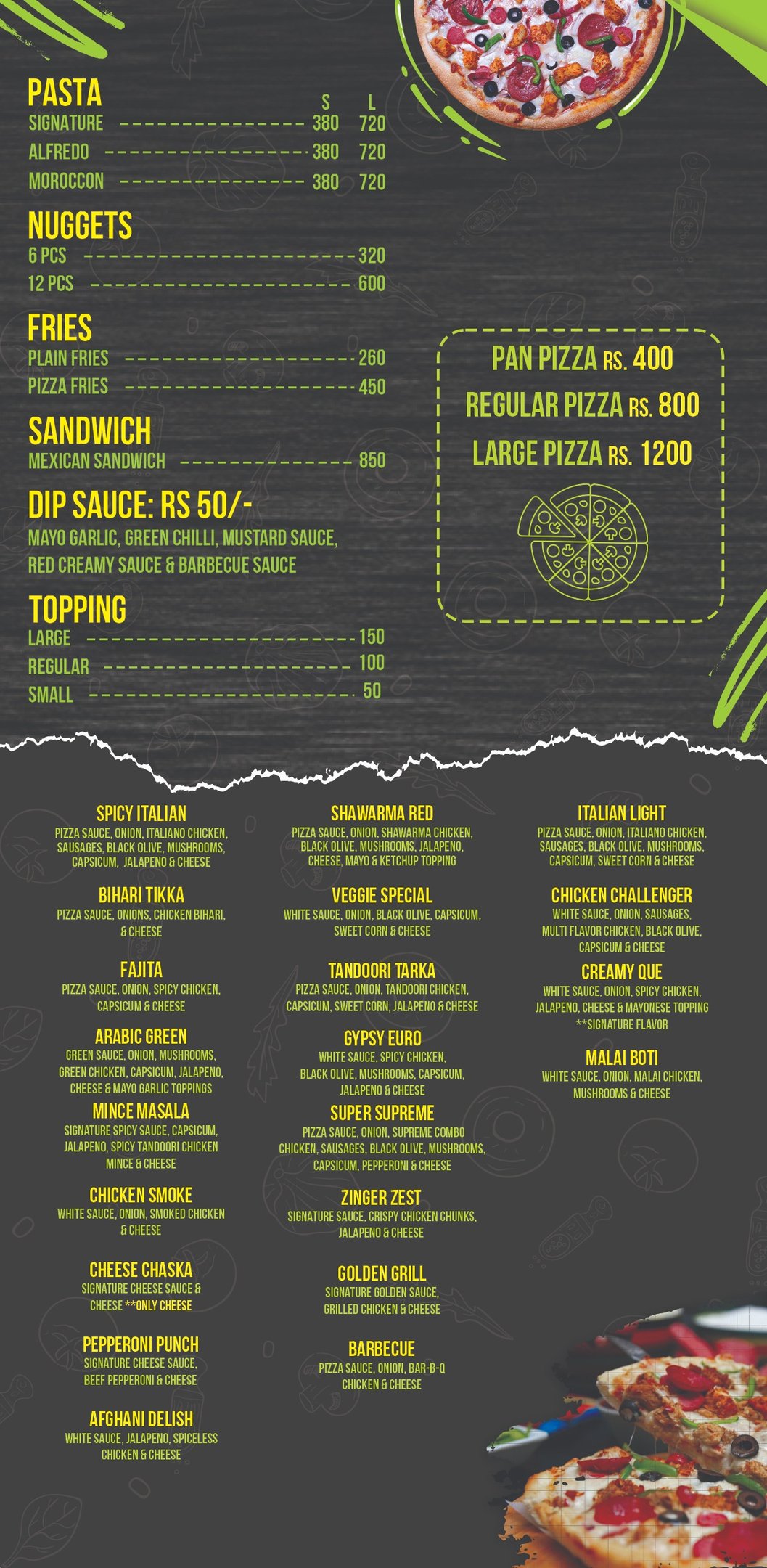 Pizza Sauce, Onion, Shawarma Chicken, Black Olive, Mushrooms, Jalapeno, Cheese, Mayo & Ketchup Topping